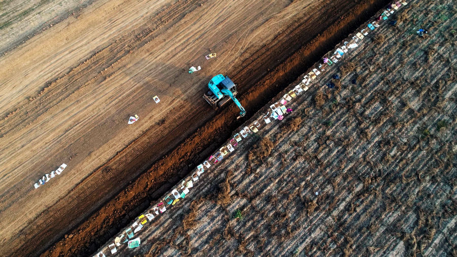 11月14日,河南省焦作市武陟县西陶镇七倍怀药种植合作社的社员在采挖怀山药。初冬时节,河南省焦作市武陟县种植的怀山药陆续进入收获期,当地农民抓紧采挖、加工、销售。近年来,有着“怀药之乡”美誉的河南省武陟县把工业化理念纳入传统怀药产业发展体系中。通过政策资金扶持、建立种植基地、引进医药企业等方式,逐步形成了从怀药种植到产品深加工的完整产业链。目前,当地从事药材加工、销售的农民有1万多人,各类怀药加工企业153家。(冯小敏 摄)