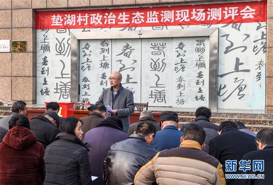 11月21日,在江苏省宿迁市泗洪县上塘镇垫湖村,镇纪委的工作人员在主持进行政治生态监测现场测评会。 为了打通全面从严治党“最后一公里”,江苏省宿迁市泗洪县纪委监委开展村居政治生态监测预警工作。每月组织部分群众代表、党员代表、村务监督管理委员会代表、乡贤代表等围绕村居党的建设、村居作风建设、严防基层腐败问题等30项监测内容进行测评,并根据测评结果对村居干部下发黄、橙、红三级预警提醒单,以此督促行使公权力的基层人员认真履职,提升群众的满意度和获得感。 新华社记者 李博 摄